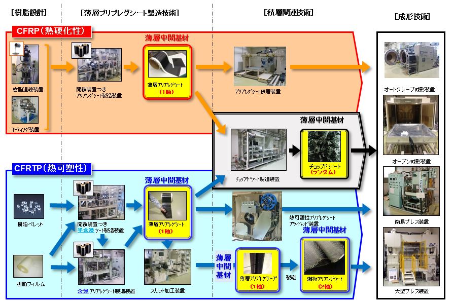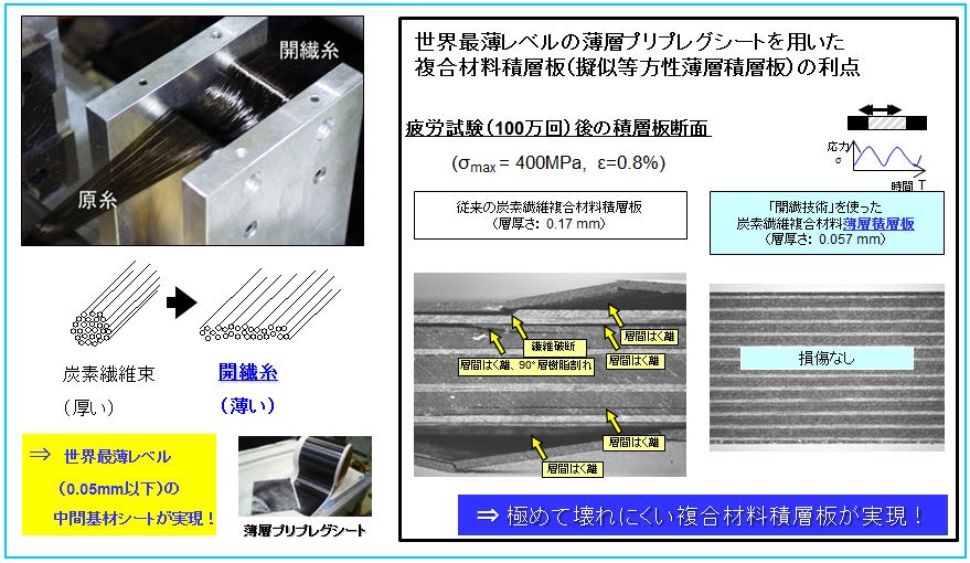 福井県では、これまでの取り組みから強化繊維束の開繊技術(福井県特許)をベースに炭素繊維複合材料関連の研究開発を行う企業を創出してきましたが、今後、より一層事業化を加速するため、研究開発から製品化に至るまでの諸問題に対して、研究開発のみならず技術経営も含めた支援を行う「ふくいCFRP研究開発・技術経営センター」(FCC)を2015年2月福井県工業技術センター内に設立しました。