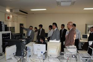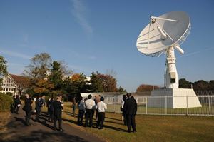 IR交流会では、10mφD空中線等の見学会も行いました。中城教授より米国ViaSat社製パラボラアンテナの仕様詳細の説明や回線設計事例も紹介されたほか、信号電力分配器、サーボモータ信号、信号伝送用の同軸ケーブルの取回しなど、空中線施設の内部までの見学会を行いました。このほか、運用室では、SバンドやLバンドの受信機の、復調周波数、入力レベル、周波数オフセットなどの監視状態などを見学や、次代と共に受信運用システムやデータ保存システムが小型化された変遷などの説明が行われました。参加者からは地元に先端研究設備があることの強みに対する期待と、新たなビジネスへの期待が寄せられ、有意義な交流会となりました。