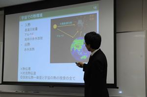 大学院生向けの資料を用いて、技術者向けの基礎論を授業形態で実施しました。太陽直達日射量と太陽強度の季節変動、地球反射光と太陽により温められた地表の発する赤外エネルギー放射、衛星の熱吸収等価式などが説明され、実際に設計に用いるべき平均値、熱制御の方法と活用できるデバイス事例などが講義されました。福井県工業技術センターからは、熱を遮断する部材の開発などが提案され、ビジネスへの繊維の応用なども議論されています。