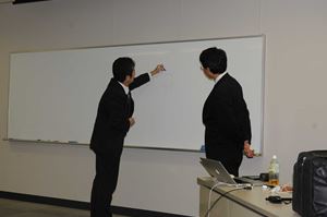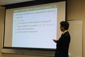 超小型人工衛星概論として講義が行われました。世界で定義される衛星のサイズ、UNISEC(大学宇宙工学コンソーシアム)をはじめとして日本で打ちあがった主な超小型衛星とミッション事例、戸谷准教授が熱設計などに関わった人工衛星が紹介されました。熱設計の役割として、環境条件に対し搭載機器が正常に動作する範囲に温度を制御することが説明されました。伝熱形態や、太陽・地球・衛星の宇宙での熱環境関係、衛星の中の伝熱、熱容量などが講義されています。また、熱制御方法と特徴、太陽光吸収率、赤外放射率を制御する部材の表面仕上げなど、宇宙ビジネスに直結するパラメータの説明と熱設計の手法などが講義されました。参加者からは衛星内部測定位置、グラフについて変化点の原因、地球を原因とする蝕との関係など、多くの質問が寄せられ、高い興味を示された講演となっています。