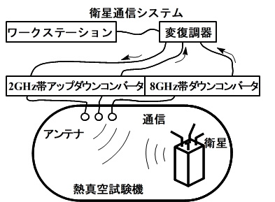 <主な使用事例・特徴>本システムは、超小型人工衛星の熱真空試験中における、衛星本体の健全性の確認に用います。 熱真空試験は、衛星本体が真空中での低温と高温との繰り返しにおいて、衛星各部が正常であることを確認するために行います。そのため、地球周回軌道を模擬した、実際の通信と同じ方式にて行う必要があり、熱真空試験機内部に置いたアンテナで通信し、衛星の健全性を確認します。 |
