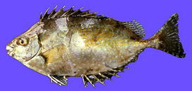 アイゴ科 地方名:サンチョ(三国)、カシノハ(越廼)、チンチョウ(河野)、バリ(河野・敦賀)、テッキ・ハラゴチ・ヨヨシ(敦賀)、ウオヨシ(美浜)、イテテ・ウオサシ・ハラノテ(和田)、アツブチ・ハラクチ(高浜) 体は楕円形で著しく側扁する。体色は銀色を帯びた淡褐色で、灰白色の大型斑紋と多数の同色小型斑紋、または不規則な暗色斑が散在する。背鰭に7本、腹鰭に2本、腹鰭に2本の棘条があり、これに刺されると激しく痛む。全長30p位になる。主に沿岸域の藻場に生息し、刺網、定置網、釣り等で漁獲される。産卵期は春から夏。稚魚は、動物プランクトンを食べるが、成長に伴い、エビ・カニ類、多毛類の他、海藻類も摂餌する雑食性に変わる。皮や内蔵は特有の磯臭さをもつが、煮物、塩焼、干物等にすると美味。 |