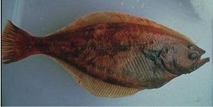 カレイ科 地方名:アカガレ(三国・敦賀)、マガレイ(福井・越廼)、ミガレイ(福井・甲楽城) 有眼側(右)の体色は、暗褐色で、両眼の間には小さな鱗がある。上顎の後端は、下眼の後縁直下に達する。側線は胸鰭の上でゆるく湾曲している。全長40pに達する。底曳漁場におけるカレイ類の代表種で、ズワイガニを対象とする底曳網に混獲される。水深150〜500m迄生息するが、主な漁場は200〜350m水深帯に形成される。初漁期(9〜12月)には450m、盛漁期(1〜3月)には接岸して170〜270m水深帯へ移動、その後、終漁期(4〜5月)には、再び230〜320m水深帯へと漁場が変化する。産卵期は3〜4月。クモヒトデ類や甲殻類を主な餌料としているが、小型頭足類、二枚貝類、小型魚類等も捕食する。刺身の他、塩焼、干物、煮物等にすると美味。 |