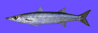 カマス科 地方名:クチレイ(三国)、ハザツラ(和田)、カマス(全県下) 体は円筒形で下顎が上顎より長く、受け口となっており、歯が鋭い。背部は赤味がかった黄褐色。腹部は銀白色で体側に明瞭な暗色縦帯がある。各鰭は黄色味を帯びる。最大で全長50p前後になる。主に中・底層を遊泳し、10月を中心に定置網で漁獲される。産卵期は6〜7月。幼魚(5〜10p)は沿岸の藻場に生息するが、成長につれて沖合へ移動する。鋭い歯で小型のアジやイワシ類を捕食する。近縁種のヤマトカマスは、第一背鰭が腹鰭の真上にあること、体側に暗色縦帯のないこと等で区別できる。本県に分布するカマス類は主としてアカカマスである。肉はやや水分が多いが、干物にすると美味。ムニエル、柚庵(ゆうあん)焼、空揚げ、干物、塩焼や刺身にもされる。 |