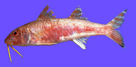 体はやや細長く、下顎に2本の黄色のヒゲがあるのが特徴。体色は全体に赤色で、腹部は白。背鰭と尾鰭の上方には赤色縦帯がある。全長20p位になる。沿岸の砂泥底に生息し、底曳網で他魚種と混獲される。産卵期は8〜10月。多毛類や貝類等の底棲動物を捕食する。やや美味で、干物や煮物、天ぷらにされる他、かまぼこの原料等にもなる。
