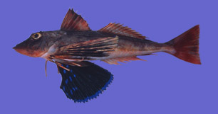 頭は大きく、吻前部に小棘がある。胸鰭は大きく、拡げると背面は鮮やかな青緑色。また胸鰭下方の3軟条は指状に変化しており、海底を歩くようにして移動する。全長40p位になる。主に水深20〜100mの砂泥底に生息しており、刺網や小型底曳網等で漁獲される。産卵期は夏。甲殻類、多毛類を捕食する。肉は白身で、刺身、塩焼、椀種、鍋物、煮物にすると美味。