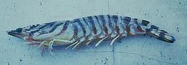 クルマエビ科 地方名:サイマキ(全県下) 浅海に棲むエビ類の中で最も大型で価値の高いものである。頭胸甲から尾節にいたるまで茶色の横縞があるのが特徴である。体長25p位にまで成長する。水深30m以浅の砂泥底に生息する。昼間は砂に潜っているが、夜間には砂からはい出して活動する。主として刺網、小型底曳網で漁獲され、盛漁期は5〜9月である。産卵期は6〜8月。近年各地先で種苗放流が盛んに行われている。エビ類の中で最も味が良く、天ぷら、フライ、刺身等にすると特有の甘みがあり、具足煮、おにがら焼、椀種、すし種(おどり)等にしても美味。 |