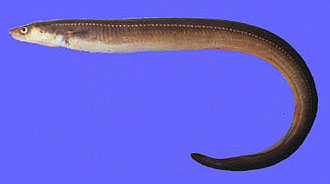 アナゴ科 地方名:ハモ(越廼・小浜・高浜)、アカケツ(和田) 体はほぼ円筒状で細長く、腹鰭はない。 体色は全体が暗褐色で、背鰭、臀鰭、尾鰭の縁は黒色。側線の開孔部が白色であり、側線の上にも白点が並ぶ。また、眼の後方にも少数の白点がある。全長は1mに達する。沿岸域のおよそ50m迄の砂泥底や岩礁の割れ目などに生息し、夜間活動する。冬期には100m位の深所へ移動する。底曳網や篭で漁獲される。産卵期は春〜夏と推定される。小型魚類、エビ・カニ類、イカ・タコ類を捕食する。天ぷら、すし種、蒲焼、八幡巻、ほうろく焼、鍋物、茶碗蒸等の材料になるが、煮る場合でも一度焼いてから使うと身くずれがなく、香ばしくなる。 |