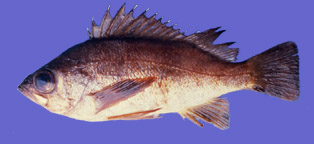 フサカサゴ科 地方名:ハチメ(三国・鷹巣・越廼・敦賀)、メバチ(越廼・敦賀)、キハタ・ヨネズ(河野)、イシメ・イソメバチ・クロカワ(敦賀)、ナメラ(敦賀・和田・高浜)、アカモ(小浜)、アコ・シロヒゲ(和田・高浜) 頭部は大きく、体は側扁する。下顎は上顎より突出する。体色は生息場所によって異なり、灰褐色・灰赤色・黒灰色とさまざまである。全長25p位になる。水深5〜50mまでの岩礁帯に生息し、数十尾の群をつくる。釣りや刺網等で漁獲される。卵胎生で、12〜3月にかけて全長4〜6oの仔魚を産む。魚類、イカ類、甲殻類、多毛類を捕食する。刺身、煮物、塩焼にすると美味。 |
