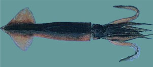 スルメイカ科 地方名:シリクサリ・トクサイカ・ホンイカ(越廼)、ウジイカ(敦賀)、シリヤケ(美浜)、シンコ(日向)、カワイカ(小浜)、シリイカ(和田・高浜)、ヒイカ(高浜)、オオシリ(小黒飯)、シリ(嶺南)シンコイカ(幼イカ・全県下) 本県で最も漁獲量が多く、重要なイカ類の一種。体色は鮮度のよいものは茶色で、鮮度の落ちたものは白色からピンク色と変化する。腕の長さは胴長の半分程度で、鰭の長さは胴長の約3.5分の1である。1年で胴長28pに成長する。暖流海域の30〜100m位の層に生息し、昼間は下層にいるが、夜間には上層に浮上する。ほとんどが釣りで漁獲され、盛漁期は7〜10月である。産卵期は10〜2月。主に稚魚類や小型のエビ類を捕食する。刺身、天ぷら、フライ、焼物、塩辛、煮物、干物と用途が広く、最近は海のサラダ≠フ材料としても多く使われる。 |