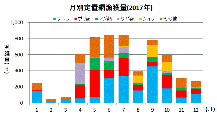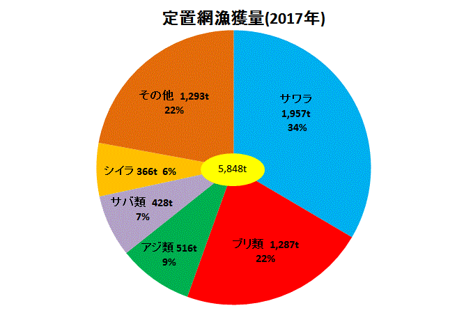 2017年の定置網漁業による年間漁獲量は5,848tでした。