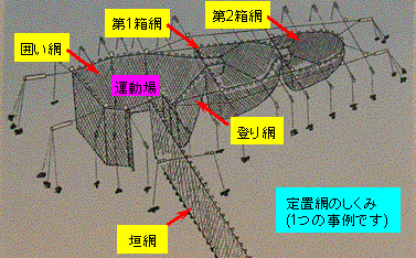 泳いできた魚は、垣網という網に沿って、囲い網で囲まれた運動場に入り、